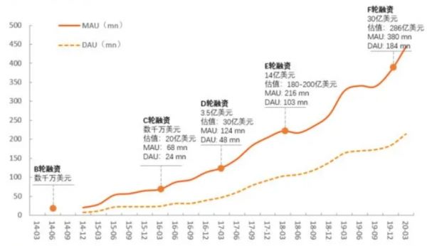 2013年底快手进军短视频,到2015年初其日活用户数就突破了1000万,此后开启了快速发展的通道,到2017年底日活用户数达到1亿,截至2020年6月底,其日活用户数超过3亿。伴随用户数的快速增长的是多轮大规模的融资和不断创新高的估值。