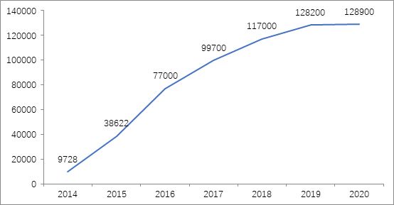 从上图可以看出,2015年每一用户每月使用流量仅380MB,而到2020年这一数字增长到10.35GB,尤其明显的是从2017年起每户每月流量突破1GB,此后流量使用形成爆发式增长。