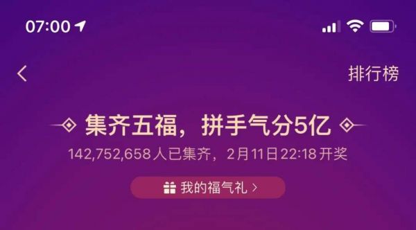 从2016年开始,支付宝每年春节前都会举办“集五福”活动,今年的集五福已于2月1日0点正式开启。截至2月7日7时,已经有超1.42亿人集齐五福。