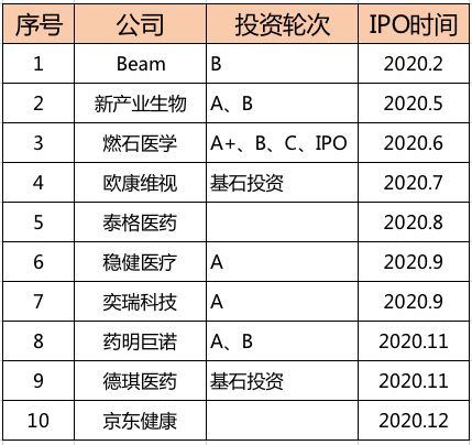 相较于其他投资机构,红杉中国在医疗健康领域内的投资有着其鲜明的特点,其中之一即早期介入以及长期陪伴。2020年IPO的10个红杉医疗被投企业中,Beam、新产业生物、燃石医学、稳健医疗、奕瑞科技、药明巨诺等多家公司,红杉中国均是在A轮或B轮及早期介入,而不少项目更是陪伴企业走完了全程,例如燃石医学。2015年,红杉资本中国基金在A+轮投资燃石医学,并在此后每一轮都不断加持,一直到其IPO。