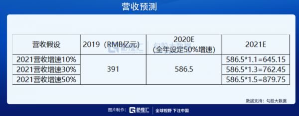 2020年前三季度,快手总营收为407亿元,Q3单季度营收为154亿元,前三季度总体营收同比增速为50%。我们假定快手在四季度可以维持同样水平的增速,然后给予2021年不同的营收增速假设,可得到2021年快手预测营收如下: