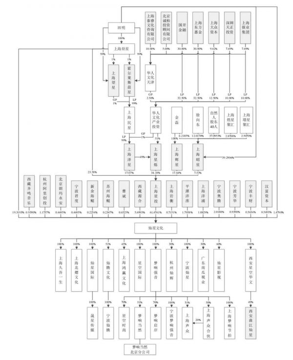 据灿星最新的招股说明书显示,灿星的第一大股东是上海星投,持股61.6761%。上海星投的主要股东为上海星烁,该公司为华人文化产业投资和田明旗下公司上海泽星共同拥有,持股比例分别为51%和49%。