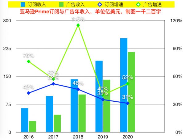 如果对比一下亚马逊Prime订阅收入和广告收入的增速曲线,会看到广告的上升势头更猛。Prime收入依赖于会员基数的增长,是一个线性过程;但广告不一样,平台第三方销售规模增长明显,会带动商家广告投放成倍增加,让这个雪球加速滚起来。这也是亚马逊新兴业务中被投行普遍看好的一块,尽管在线广告受大环境影响波动性更大。