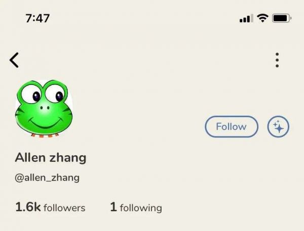 今天(2月7日)早上我在使用 CH 时,在别人的 follow 列表里无意间发现了一个熟悉的头像和名字,一个绿青蛙头像和一个叫 Allen zhang 的名字。