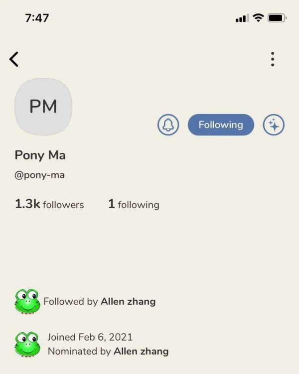 我看了下,现在绿青蛙被 1600 多人关注了,但他只关注了一个人,这个人叫 Pony Ma。而且,他是被 Allen zhang 邀请进来的。