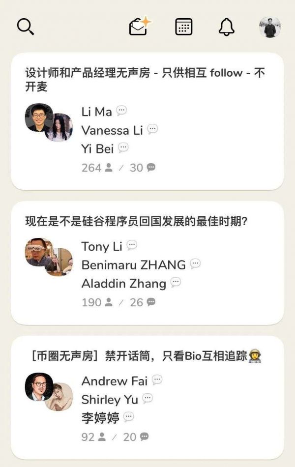 我相信有很多人每天打开 CH 的一个动机就是看看今天里面有哪些有意思的房间,「刷房间」就成了消费内容的一种方式,房间本身就成了内容。包括了主题和人。