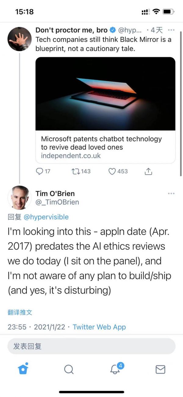 他表示,该专利申请于 2017 年 4 月,早于公司成立的人工智能道德审查组(他本人是审查组专家)。微软并没有开发该聊天机器人的计划,他本人也承认这项专利有点 “令人不安”。