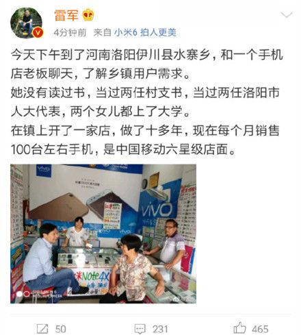 颇为讽刺的是,雷军曾于2017年8月率队前往河南等地进行线下手机市场考察时发布微博(见下图),赞赏小县城手机店老板的辛勤经营(后因照片中过于显眼的VIVO广告而将该消息删除)。而如今,小米却将升级成本强势转嫁于下游,经销商抱团维权的同时,更隔空喊话雷军:你对得起米粉吗?