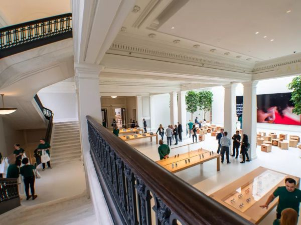 举个例子,苹果设计团队和Foster+Parters建筑事务所合作,直接把美国一座106年历史的公共图书馆改造成一座现代化又时尚的零售空间。该项目总共投资2亿美金,保留图书馆原有的新古典主义风格,同时将苹果的简约格调融入进去,连内部一些小细节都被精心修复。