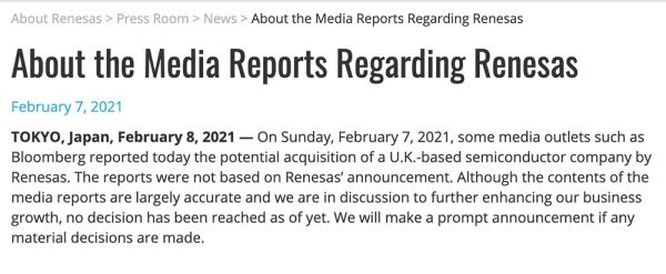 其中第一篇公告是瑞萨电子针对彭博社报道的回应,称“虽然媒体报道的内容基本准确,我们也在讨论进一步促进业务增长,但目前还没有做出决定。如有重大决定,我们将立即通知。”