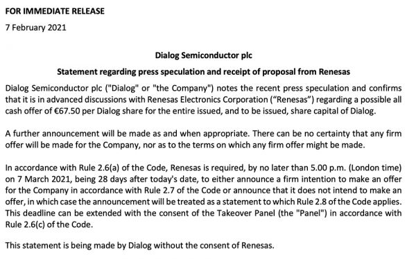 今年2月7日,Dialog在《关于新闻投机和瑞萨电子收到提案的声明》中提到:正在与瑞萨电子进行深入讨论,可能对Dialog全部发行及即将发行的股本提出每股67.5欧元的全现金收购要约。
