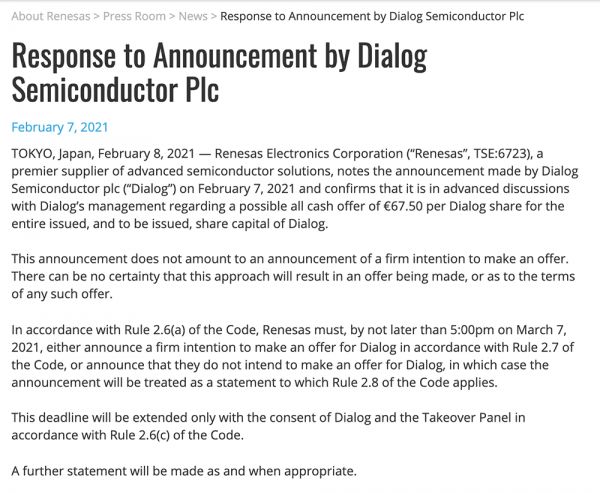 第二篇公告则是回应Dialog的声明,瑞萨电子同样确认了其正在与Dialog管理层进行高级讨论,讨论范围包括Dialog全部发行股本的现金要约价格,每股67.5欧元。