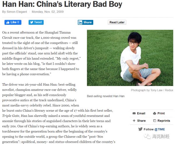 据海克财经不完全统计,21世纪的第一个10年,韩寒至少出版了17本书。他的名气甚至冲出了国门,漂洋过海到了遥远的美利坚——2009年11月,韩寒登上美国《时代》杂志,文章标题给27岁的韩寒下了一个定义——中国文坛的坏小子。