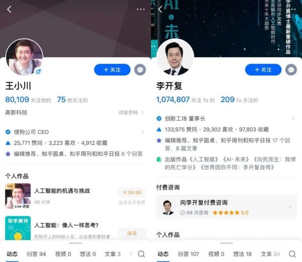 李开复、王小川知乎主页