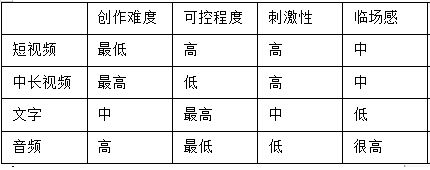 其次是中长视频和文字,这类内容的消费成本比较高,用户需要投入一定的时间和精力才能完成一次消费。