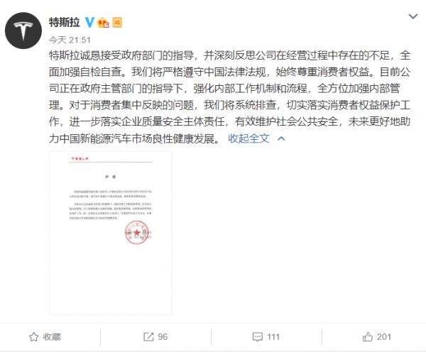 对于被约谈一事,特斯拉在8日晚间火速发布声明称:“诚恳接受政府部门的指导,并深刻反思公司在经营过程中存在的不足,全面加强自检自查。”同时,对于消费者集中反映的问题,将系统排查,切实落实消费者权益保护工作。