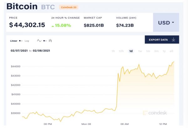 受该消息影响,比特币顿时直线拉升,价格几乎触及45000美元。