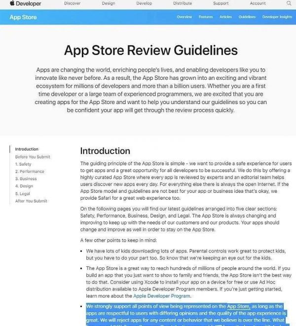 Guidelines是2000多万iOS应用开发者和App Store中180多万应用程序“触达全球数亿人”所必须遵守的规则。Apple指出,App Store是“highly curated”,“每款应用都经过专家审核。”Guidelines的介绍部分警告说,Apple可以在任何时候制定新规则,并解释说,“我们将拒绝任何我们认为含有超出底线的内容或行为的应用程序。
