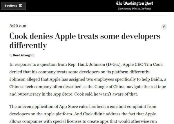 小组委员会回顾了Apple公司CEO Tim Cook和百度(Baidu)一位高管之间关于Apple是否会向Baidu提供优惠待遇的沟通。在小组委员会的第六次听证会上,议员Johnson质询Cook,Apple在对待应用开发者的方式上是否存在差异。