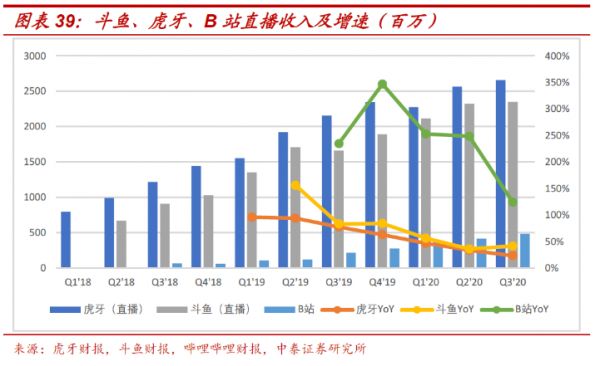 只不过从目前的B站总体业务来看,“直播”暂时还没有扮演那么重要的“创收角色”。根据中泰证券的计算显示,简单刨除来自大会员的收入,B站2020Q3的直播业务收入约为4.8亿,整体收入仅有斗鱼与虎牙的1/6左右。