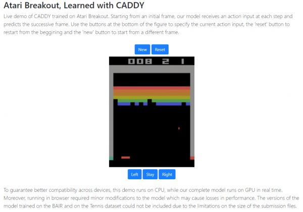 实验结果令人振奋。CADDY自动捕捉了关键动作并生成可控的播放视频,生成视频的种类很多,从游戏视频到真实的视频不等。在BAIR数据集、Atari Breakout和网球数据集上测试其模型,每个动作捕捉一个特定的表现行为,保证了动作含义的一致性。
