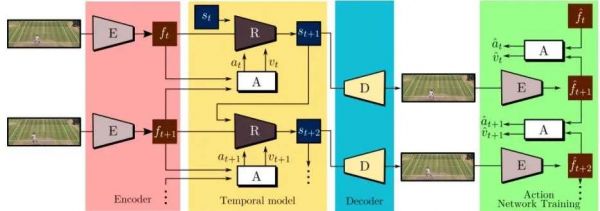 研究人员表示,无监督可播放视频生成架构是由几个元素组成的。编码器E从输入序列中提取框架表示(frame representations)。时间模型使用递归动态网络R来估计连续的状态,同时操作网络A根据输入序列预测动作标签。最后,解码器D重建输入框架。在这个过程中,模型的主要驱动损耗是重构框架部分。”