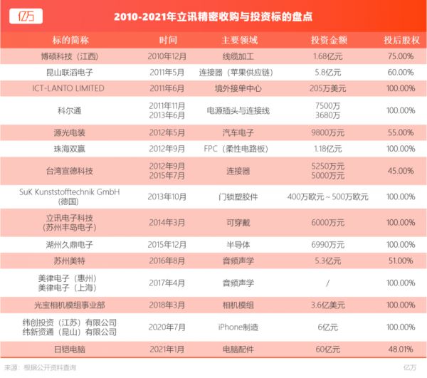 十年间,立讯精密完成十几次收购,目前贡献利润的大部分资产都是收购而来,实现了由点及面的业务扩张。如今,其业务涵盖电子消费产品、通讯产品、汽车及医疗产品。