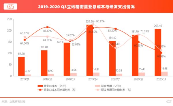 产品精进源自研发投入,立讯精密在研发投入比重逐年增加,仅2020年三季度研发金额已增长至18.98亿元,占总营收7.5%,同比增速连续4个季度超过40%。