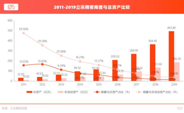 2019年末,立讯精密商誉仅1.4亿元,占总资产1.08%,投资效率可见一斑。