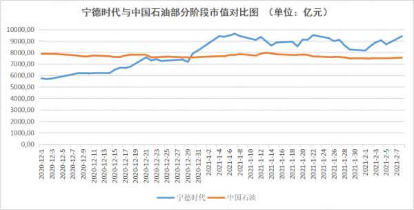 据中国能源报报道,就在去年12月21日,宁德时代的股价涨幅超12%,当日收盘股价为325元/股,市值也随即达到了7571亿元。一周后,在12月30日,宁德时代股价涨幅达到10.39%,收盘股价为340元/股,市值也达到7920亿元,一举超越中国石油当日7558亿元的市值。