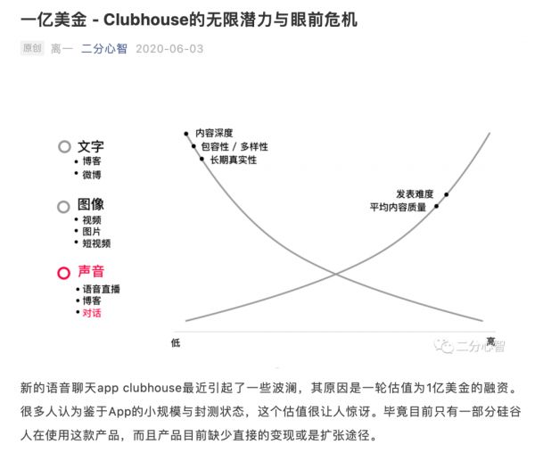 后来我也去反思,为什么相同的模式,Clubhouse 就能做成功?后来我去体验 Clubhouse,感知最强的是 Clubhouse 上用户的高质量,它的社区氛围是我们从来没有达到过的。