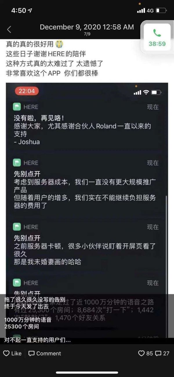 Here关停后,Joshua在朋友圈转发用户的留言