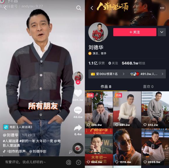 入驻抖音仅半个月的刘德华,已经轻松圈粉5500万,为了给《人潮汹涌》造势,刘天王专门更新了《人潮汹涌》短视频,轻松斩获超过600万赞,与此同时,#刘德华直播太有牌面了#话题直冲抖音热榜。除此之外,在抖音,#肖央怼刘德华#、#万茜哭戏#等相关话题也是《人潮汹涌》造话题的重要手段。