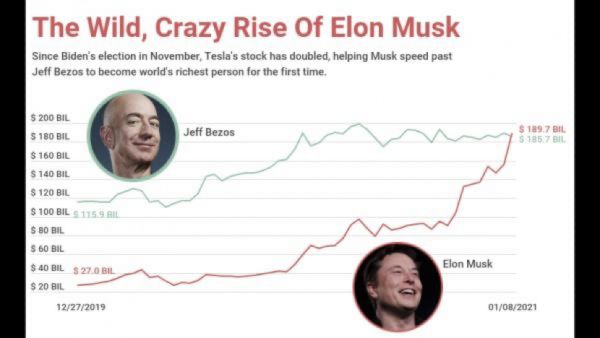2021年1月9日,马斯克登上全球首富宝座。根据福布斯富豪榜实时数据,目前他以1772亿美元身家位居排行榜第二,仅次于贝索斯。