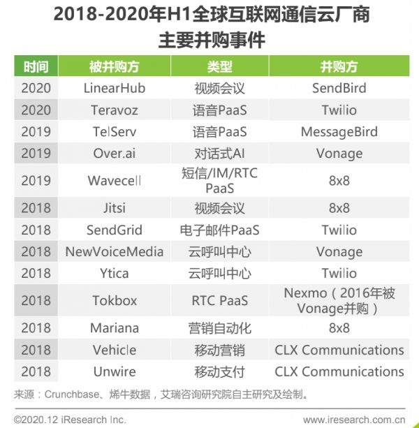 全球市场和容联的发展轨迹也有异曲同工之处。互联网通信云创业公司主要集中在美国和中国,并且近几年头部玩家,如Twilio、Vonage、CLX Communications、MessageBird等均在通过并购等方式布局全产业链。据艾瑞咨询报告,2015年是全球互联网通信云资本市场热度最高的一年,此后亿元以上的融资占比整体呈现增加趋势,领先玩家步入到C、D轮甚至是IPO阶段,头部厂商通过完善自身的通信云能力,另一方面也向应用层延伸,除视频会议、呼叫中心等通信场景外,更将业务拓展至营销场景。
