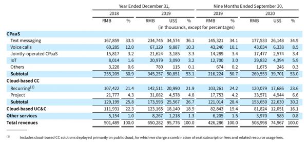 据招股书,容联云通讯在2018年、2019年营收分别为5亿元和6.5亿元;2020年前9个月营收约为5.09亿元,相比起来2019年同期营收则为4.26亿元,增长19.4%。由于容联云通讯每年营收都是第四季度最高,可预估2020年第四季度营收预计超过2亿,全年营收将超过7亿元,是这一领域营收体量最大的国内厂商。