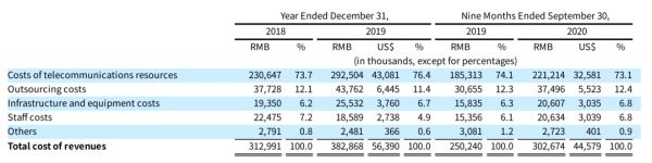值得注意的是运营商对公司业务的影响。据招股书,公司在2020年前三季度成本中超过73%是给运营商支付的费用,这对公司利润率都有关键影响。不过,受运营商影响大是这一行业的共同特性,可以作为对比的是,Twilio 2019年的成本支出中超过88%是网络资源采购。