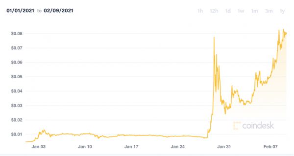 一方面又在声援散户逼空华尔街的过程中把狗狗币(Dogecoin)带飞了。狗狗币的价格从1月29日至今已经翻了11倍(但价格还没有达到10美分)。