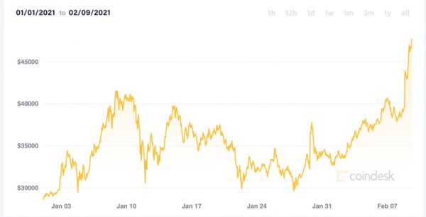 截至发稿的24小时中,比特币大涨超过20%,价格一度超过了4.6万美元/枚。自比特币突破3万美元大关以来,还从没有出现过这么大幅度的波动。