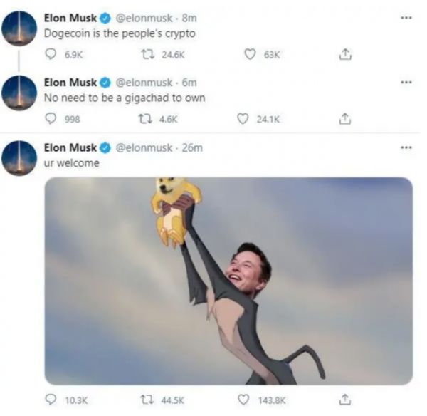 推文中,马斯克说:狗狗币是属于人民的加密货币,不需要成为土豪即可拥有。怎么听都像是暗暗踩了一脚3万多美元一枚的比特币。