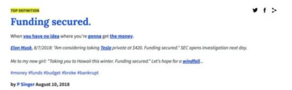 但是在后来马斯克通过媒体发表的声明中,他再次指责了SEC的不公、自己的无辜(马斯克的律师曾给SEC写过数封长信,陈述马斯克有足够的理由相信沙特主权基金确会出资支持特斯拉私有化),同时他还说,自己是在做对“投资者最有利的事”。