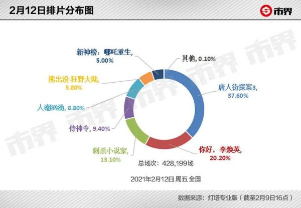 影片的排片占比,跟票房排名趋于一致。《唐探3》2月12日单日排片占比达到37.6%,《你好,李焕英》《刺杀小说家》紧随其后,排片比分别达20.2%、13.1%,剩下的几部影片的排片比还都不到10%。