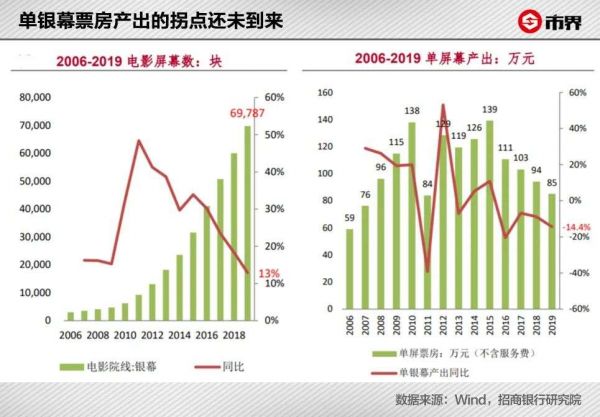 单银幕票房产出的拐点取决于票房增速以及影院数量,而在我国影院数量一直在增长,但票房增速却开始慢下来。2015年~2019年,全国票房同比增长率从49%放缓至5.4%,上座率自13%下降至11%。
