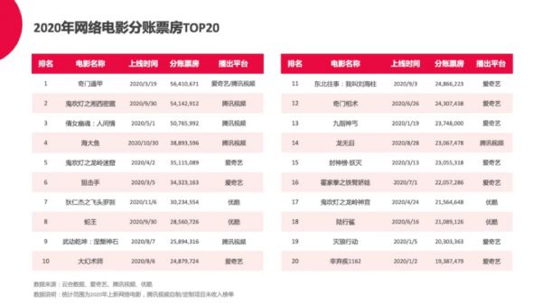 但疫情事发突然,时间紧迫,一时之间市场上优质电影内容供给显然有所不足,电影片方与平台的临时反应并未形成规模效应。从结果来看,当时的网络电影行业显然没做好准备——虽然各视频平台春节期间的网络电影排片有所增加,但2020年春节档排播的网络电影没有一部进入2020年分账榜TOP20,春节档分账破千万电影的数量还不如2019年。