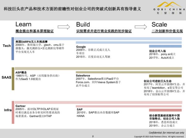 在我们看来企业服务一共经历了三个阶段,第一阶段是Learn,概念提出和基本原理验证的阶段;第二阶段是Build,识别需求并进行商业实践的初步验证,也就是从科技理念向实际产业转化的过程,这个过程中是离不开巨头引导的,因为巨头会投入更多的研发费用、研发成本和生态资源,他们更容易把一个产业方向研究聚合起来落到实际产品上;第三阶段Scale,二次创新和价值兑现。