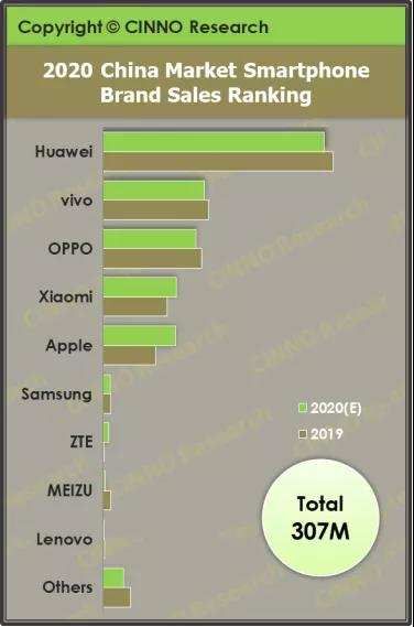 据CINNO Research《2020 年中国市场智能手机销量报告》显示,华为(含荣耀)、Vivo(含IQOO)、OPPO、小米、苹果的年销量分别为1.14亿部、5227万部、4784万部、3782万部和3751万部。魅族虽虽不至于沦为“Other”,但其销量仍远低于前述几位友商,甚至不如已经式微的中兴和联想。此外,它还是榜单中少数年销量同比下降的品牌。
