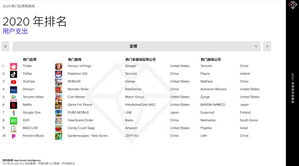 在情人节来临之际,可以预见,随着交友应用不断鼓励用户勇敢展示自己,这种趋势还会继续保持。在 2020 年非游戏应用的年度用户支出排行榜中,Tinder 仍然高居榜首,在美国和全球均排名第一。尽管 Tinder 在中国(第 8 名)和韩国(第 3 名)的用户支出都排在前 10 名,但这两个国家的本土热门应用仍然占据榜首位置。 《探探》在中国的用户支出排名第一 ,同时它在国际市场上也有庞大的受众群—— 在韩国和全球都排名第七 。