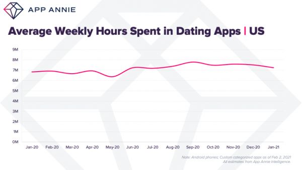 2020 年 1 月至 2021 年 1 月美国用户平均每周在交友应用中花费时长变化趋势 ,数据来源:App Annie Intelligence 截止 2021 年 2 月 2 日基于 Android 手机数据估算