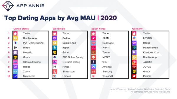 2020 年热门交友应用平均月活跃用户排行榜(从左至右依次为美国、全球、韩国和德国) ,数据来源:App Annie Intelligence 基于 IPhone 和 Android 手机数据估算(全球榜单不包括中国)