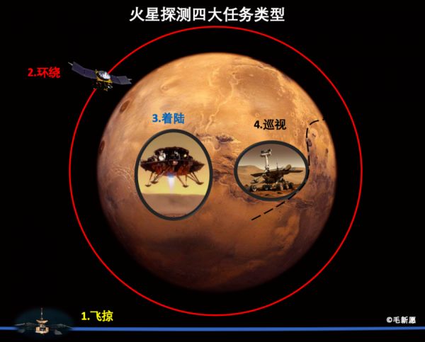 四大火星探索任务类型主要包括飞掠、环绕、着陆和巡视。